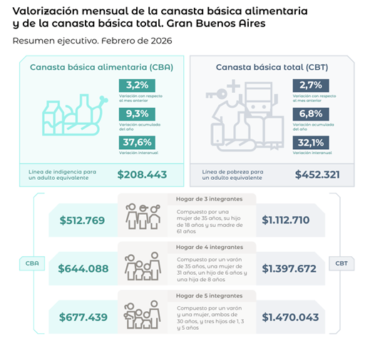 En la página 3 del presente Informe de febrero 2026 (titulado “Valorización mensual de la canasta básica alimentaria y de la canasta básica total. Gran Buenos Aires”) están los montos de la Canasta Básica Total.