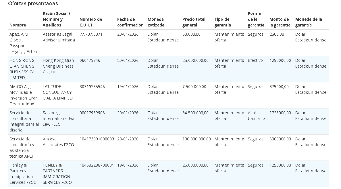 La licitación internacional N° 34-0001-CPU25 relativa a la contratación de “un (1) servicio de consultoría integral para el DISEÑO, IMPLEMENTACIÓN, LANZAMIENTO Y PROMOCIÓN de un programa de ciudadanía por inversión con asistencia técnica continua”, por el término de 4 años, fue lanzada el 5 de diciembre 2025. No hubo publicidad en los medios de comunicación argentinos. Once empresas extranjeras (ninguna argentina) manifestaron su interés en el proceso, y seis presentaron ofertas formales antes del cierre, el cual tuvo lugar el 20 de enero de 2026.